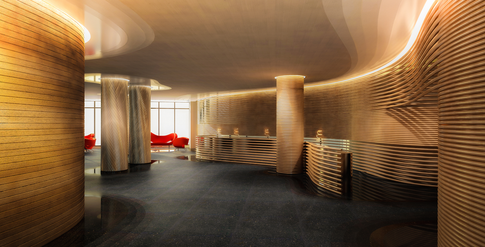 Custom-designed rugs and richly upholstered furniture adorn the lobby area. Black granite floors and plastered ceilings are articulated in a playful pattern of polished curves, which help perpetuate reflections of the key design elements.