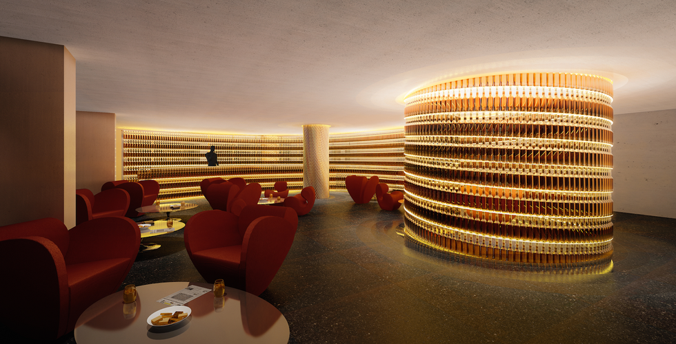A discreet polished stainless steel frame supports a sweeping array of 2,450 whisky bottles, which define the whisky bar, and wash it with rich amber light.